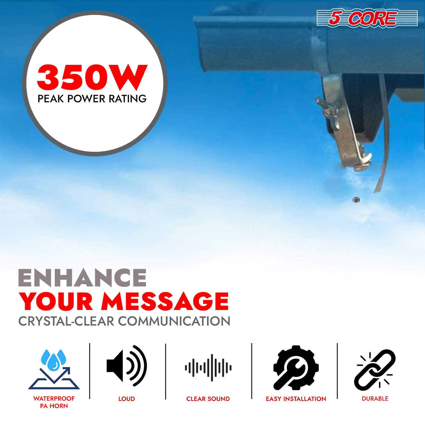 Experience unparalleled audio performance with our powerful PA horn, delivering an impressive 35W Max, 350W Peak power for clear distortion free sound even at the highest volumes. Covering vast areas, it's perfect for large spaces and outdoor events. Its wide frequency range of 400 Hz to 5 KHz ensures crisp vocal reproduction without unwanted noise. Built with heavy-duty ABS, this weatherproof loud speaker withstands harsh environments, making it ideal for both indoor and outdoor use. The included mounting bracket allows flexible installation on walls, trucks, ceilings, or poles. With high sensitivity and an 8-ohm impedance, this PA horn offers efficient performance and seamless compatibility with your existing amplifier. It is perfect for festivals, concerts, sports events, and public spaces.
