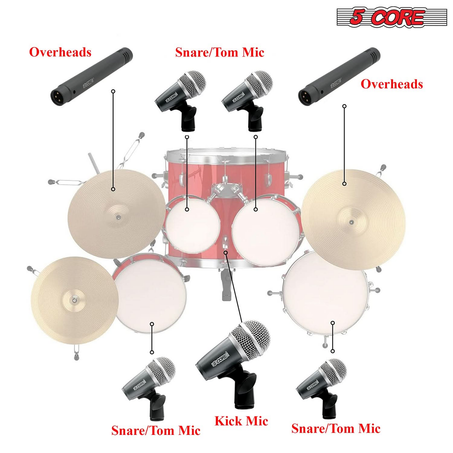 Each drum microphone is tuned to capture the unique sound of snare, toms, bass drums, and cymbals, providing a balanced and natural audio output for any 7 piece drum set |