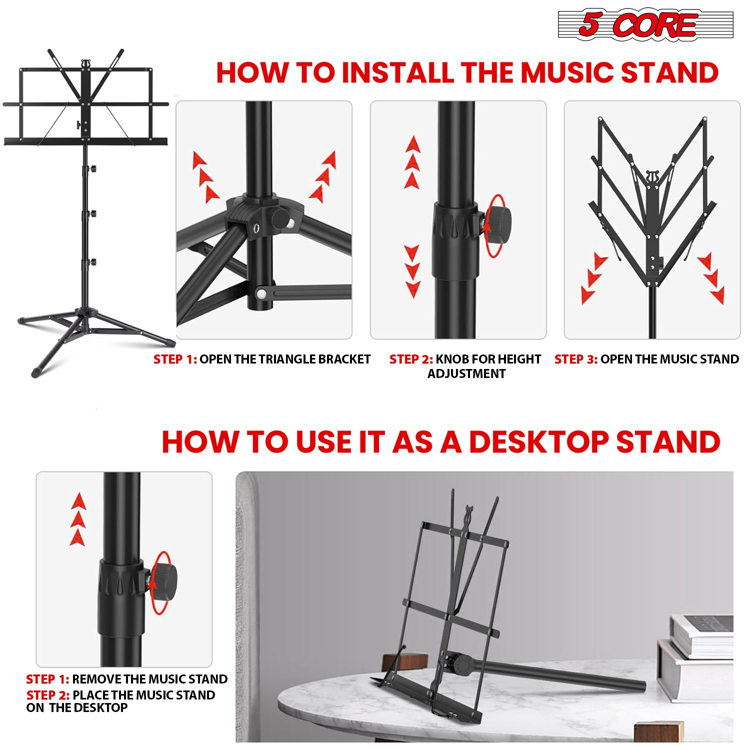 5Core Music Stand For Sheet Music Portable Tripod Adjustable Folding Note Holder