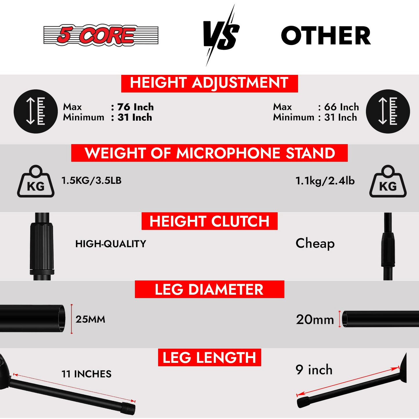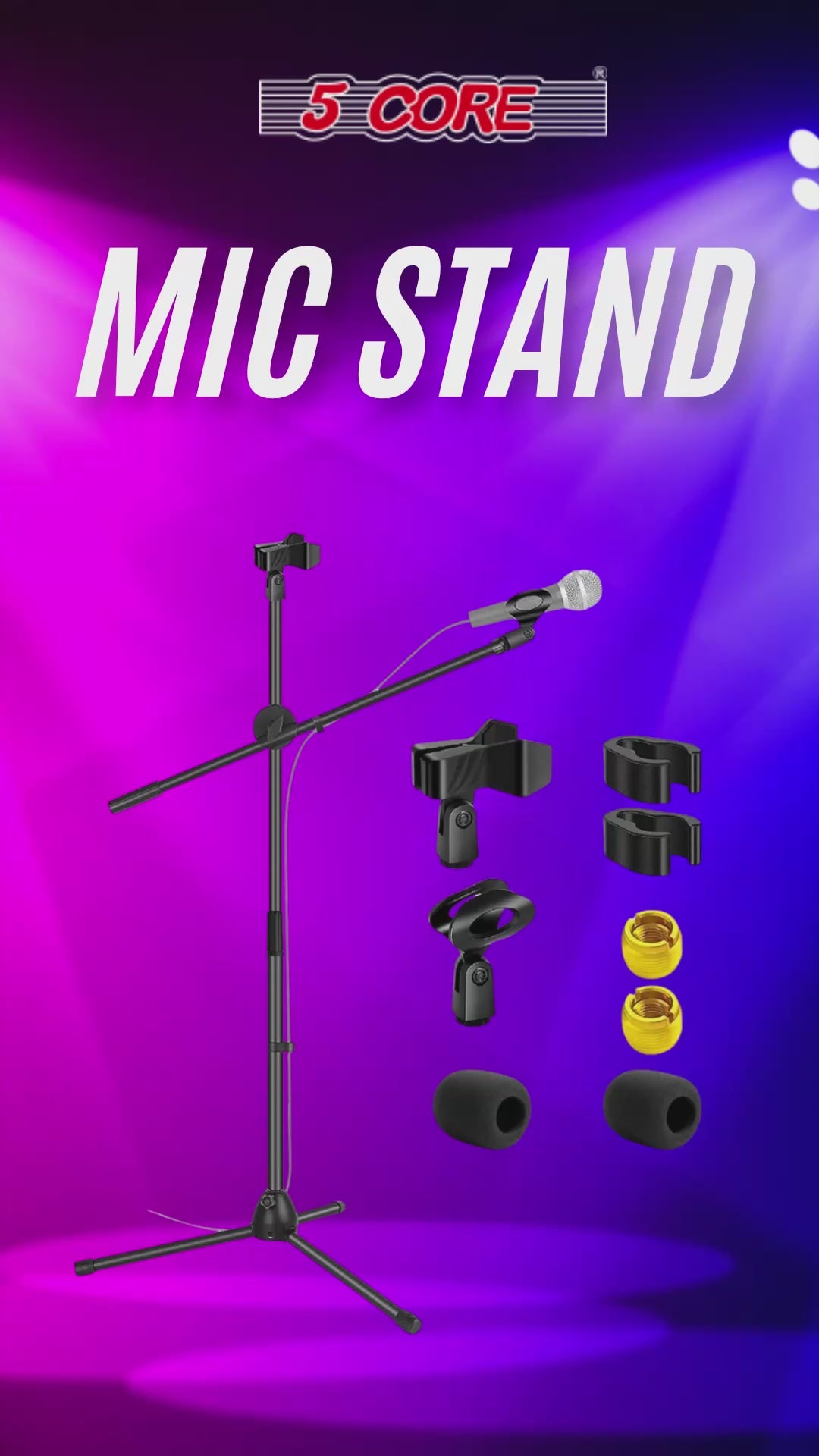 The 5 Core mic stand has adjustable height. The minimum height is 31 inches, and the maximum height is 76 inches. The 30 inch boom arm rotates 360 degrees for easy positioning, it can be lowered to 2 inches. The tripod leg design features sturdy metal legs with rubber caps, making it stable even on uneven surfaces. The heavy duty mike stand has a strong metal build quality and reinforced clutch, holding up to 3.5 lbs. This floor mic stand comes with 2 mic holders and 3/8" to 5/8" screw adapters, fitting most mics and accessories. Portable soporte de micrófono, collapsible design, and can be assembled in minutes. Perfect for anyone who needs a reliable, versatile mic stand. |
