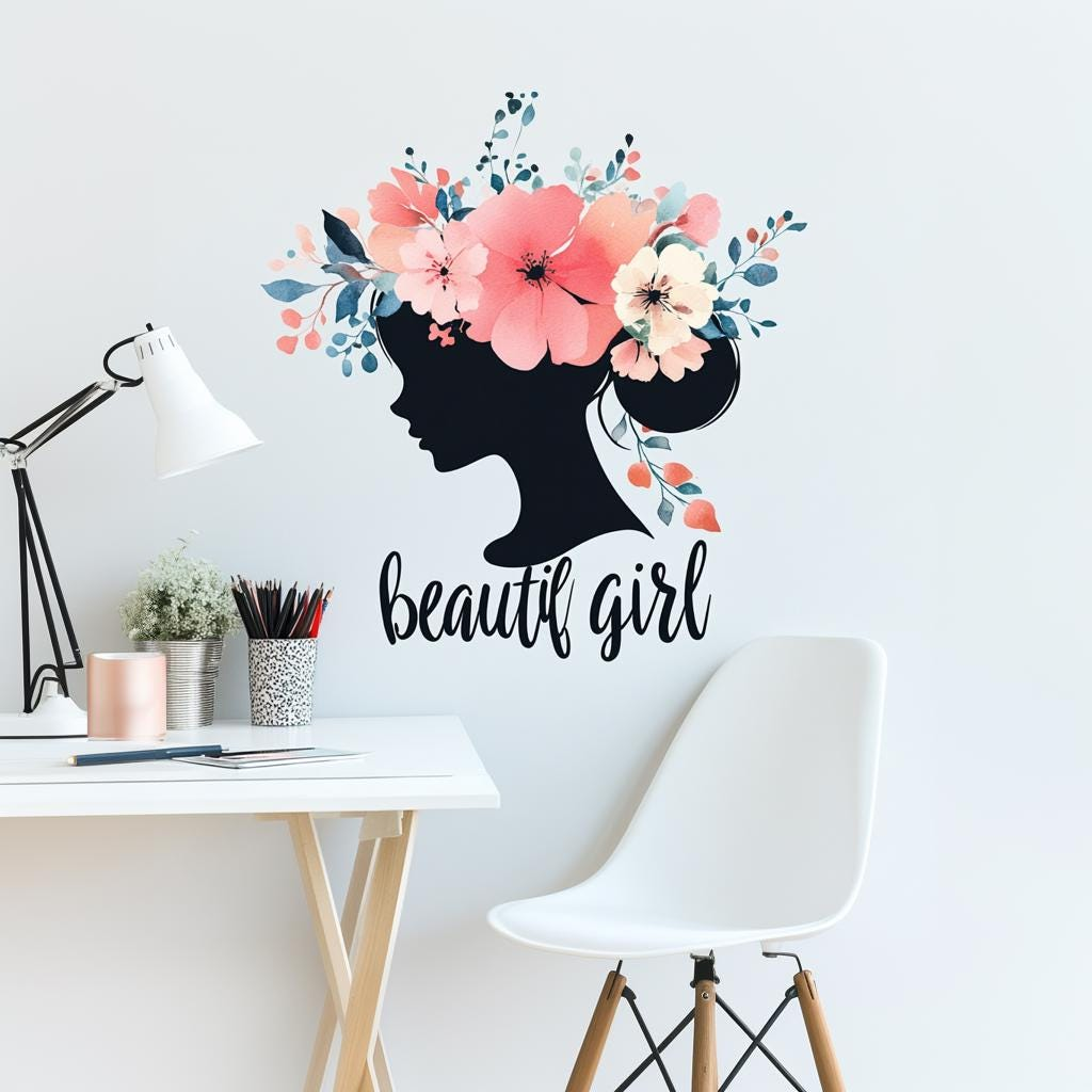 Beautiful Girl Wall Decal | Floral Silhouette Vinyl Sticker | Feminine Room Decor | Removable Wall Art for Girls’ Rooms