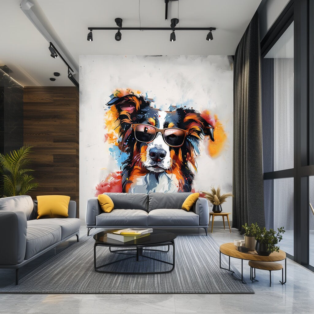 Embellish your space with our Bright Australian Shepherd Wearing Shades Wall Decal, a cheerful representation of this beloved breed in a stunning watercolor design. This wall art captures the vivacious and whimsical nature of the Australian Shepherd, portrayed amidst a kaleidoscope of vibrant hues like electric blue, radiant yellow, and playful pink, set against a spotless white backdrop. The shades-wearing pup adds a quirky and laid-back element to the design, encapsulating the essence of joy and carefree living that dogs bring into our lives.