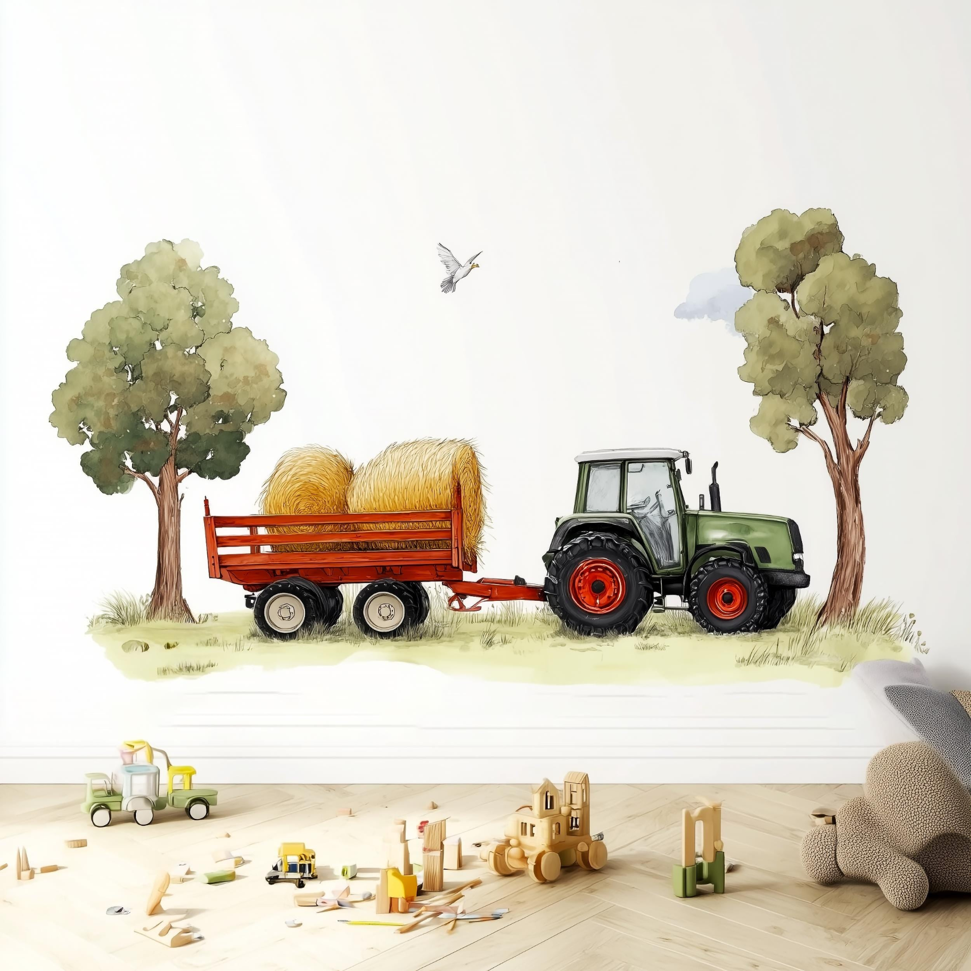 Bring a touch of countryside charm into your child's room with this **Farm Tractor Wall Decal** — a playful scene featuring a classic green tractor hauling hay bales between two trees. Perfect for little ones who love trucks, tractors, and all things farm!
