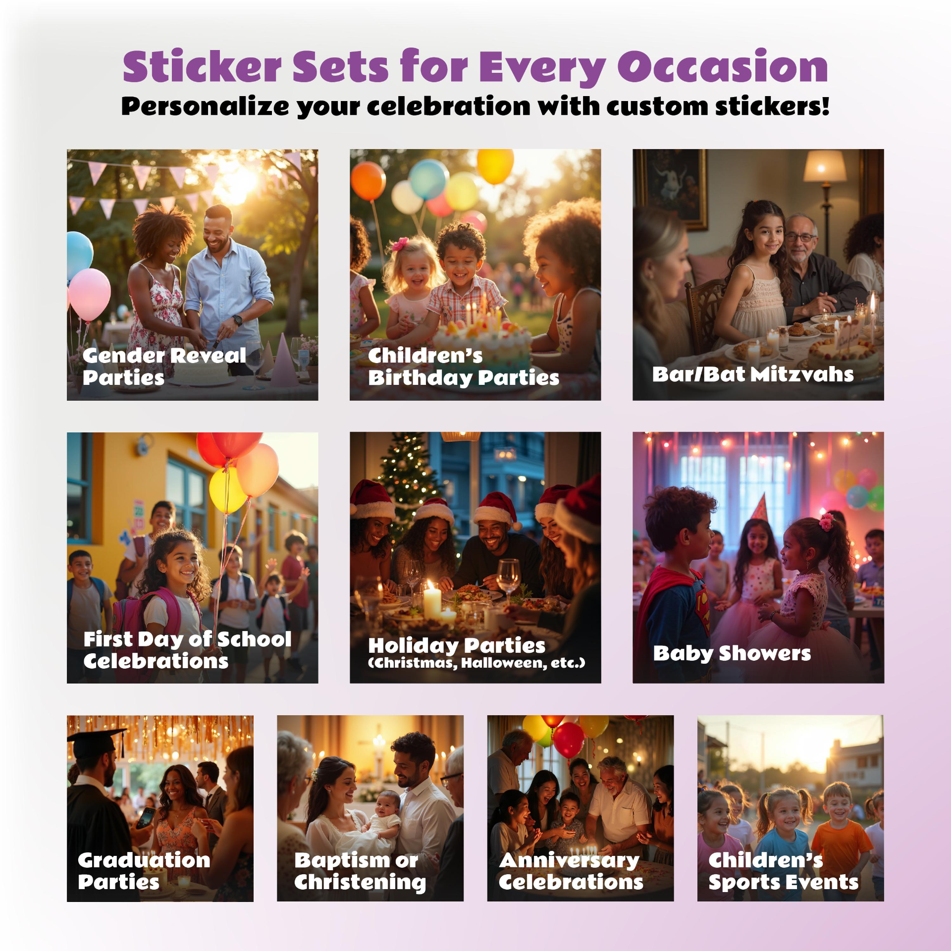 Add a personalized and festive vibe to your special day. This sticker set is ideal for decorating your party and providing your guests with a memorable experience.