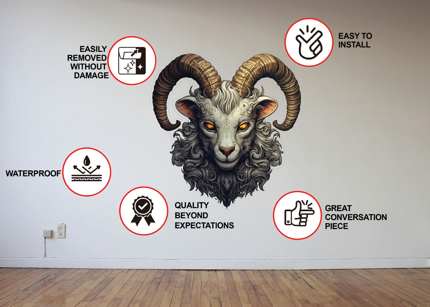 Immerse yourself in the enigmatic world of gothic surrealism with our Old Goat Head Wall Sticker, a masterpiece that bridges the realms of detailed fantasy art and psychological phenomena illustrations. This captivating decal features an old, weathered goat head, rendered with intricate detail that evokes a sense of ancient wisdom and mystery.