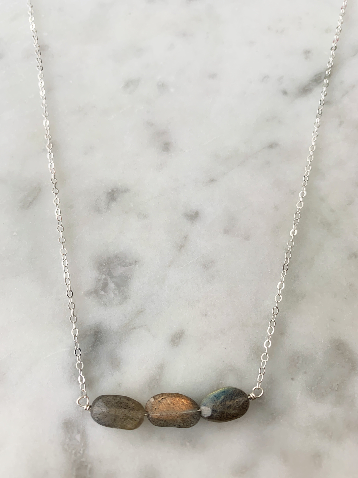 A sterling silver necklace with 3 oval stone labradorite bar pendant.