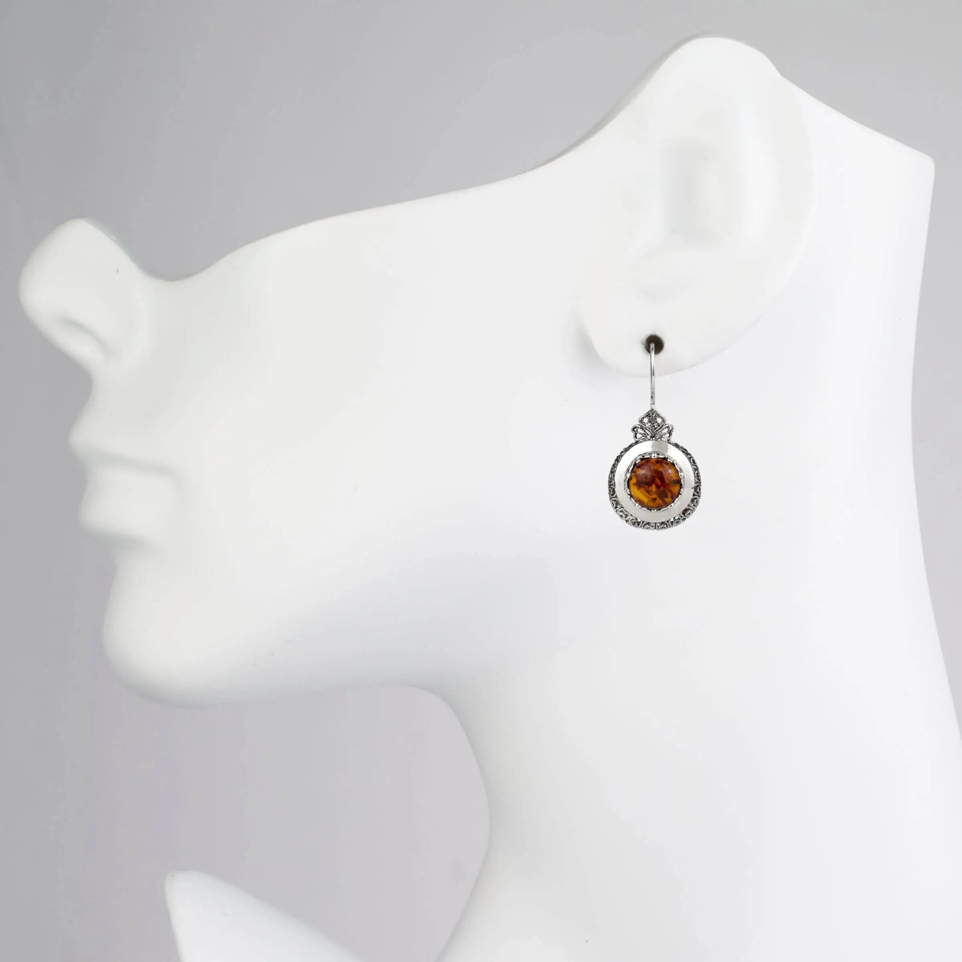 Sterling Silver Filigree Art Amber Stone Women Drop Earrings