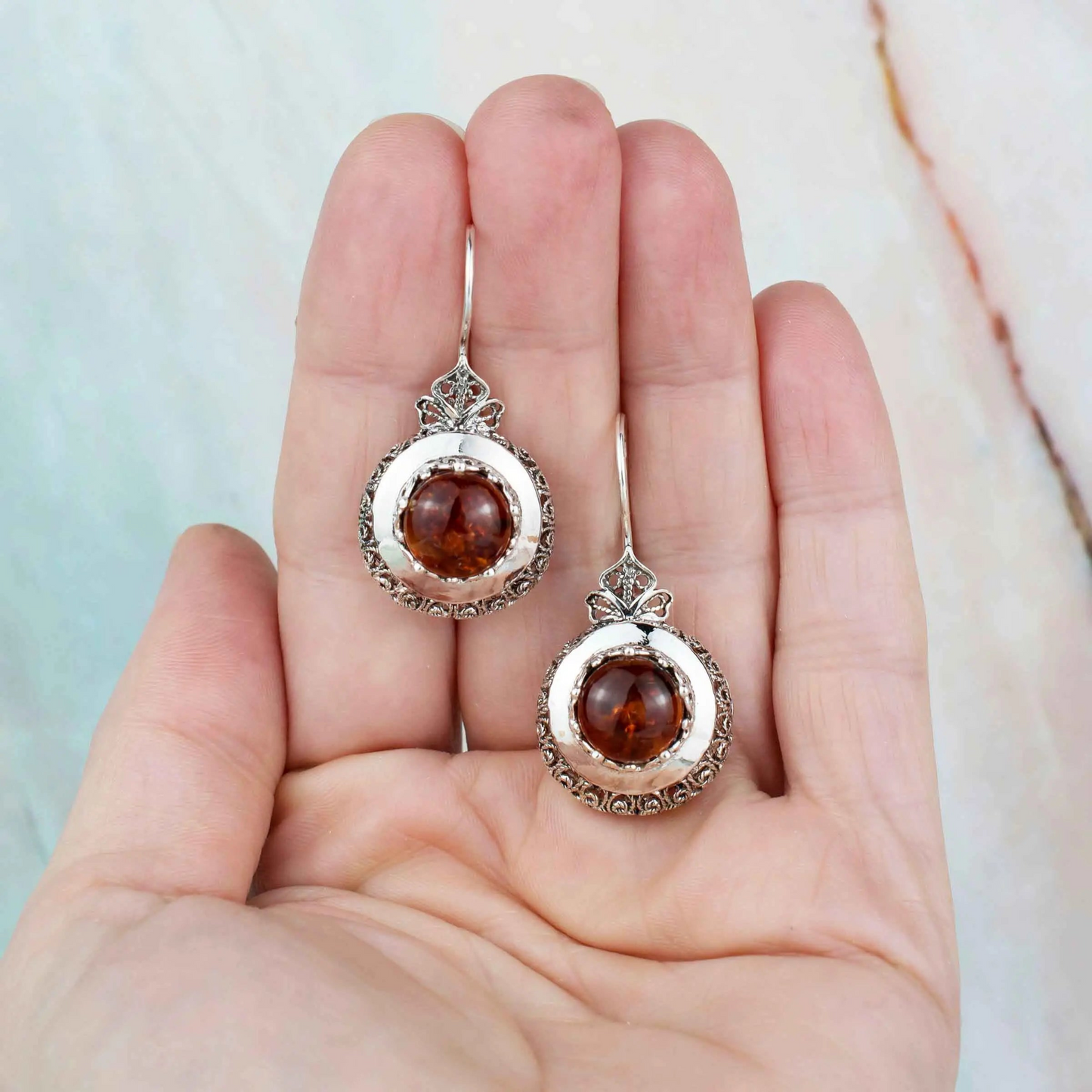 Introducing these exquisite filigree drop earrings featuring a stunning amber stone that will add a touch of elegance to any outfit. Meticulously crafted from high-quality 925 sterling silver, these earrings are oxidized to create a unique vintage look and highly polished to create a luminous shine. The warm golden tones of the amber stone complement the intricate filigree art design, making these earrings perfect for any occasion.