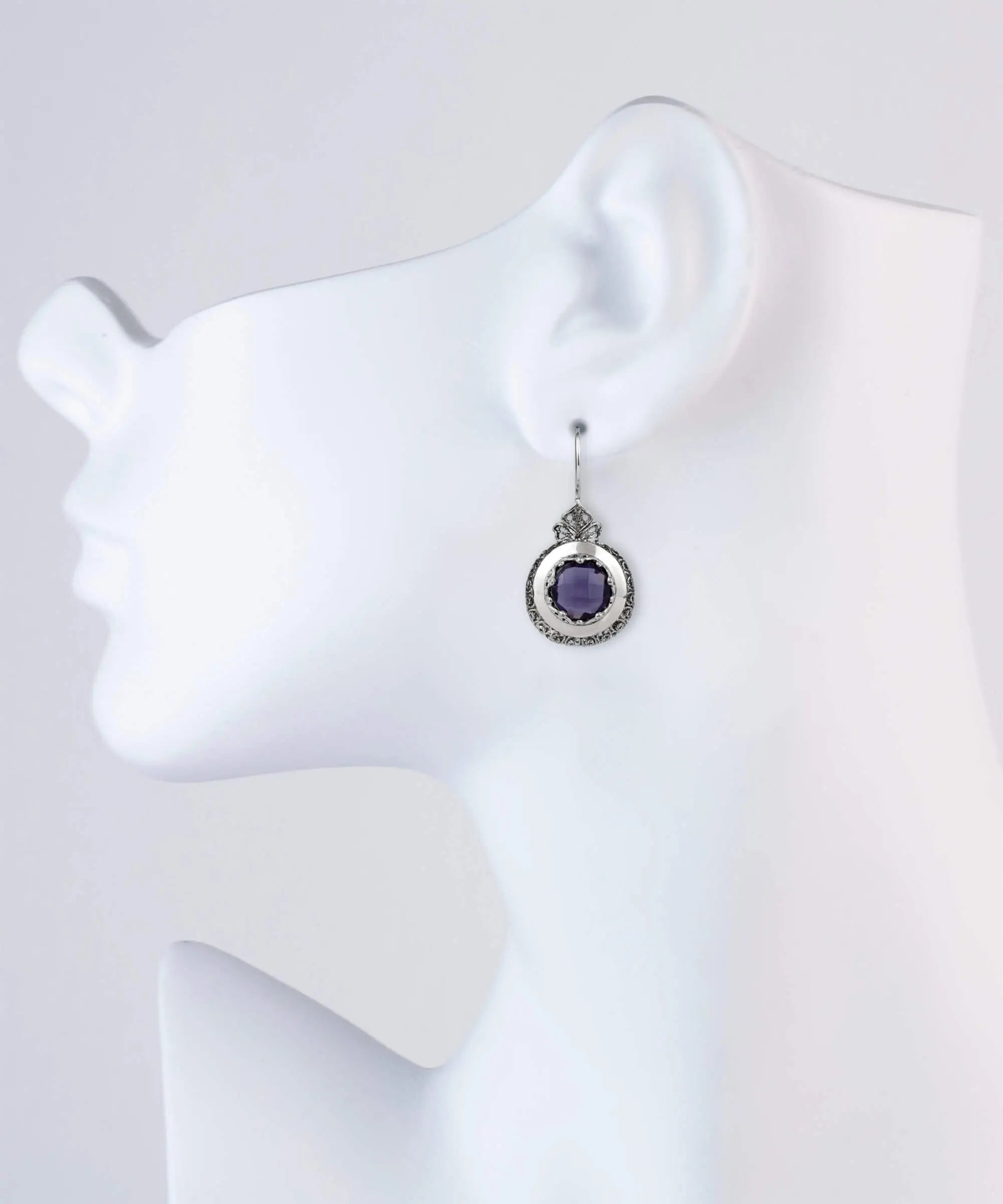 The intricate filigree art design is a testament to the craftsmanship and attention to detail that went into creating these earrings. Each earring features a double-sided, faceted, checkerboard round-cut amethyst gemstone, measuring 10.00 mm. The filigree is made of delicate metal strands that have been skillfully fashioned to create an outstanding combination of old and modern art, originating in Mesopotamia and Anatolia.