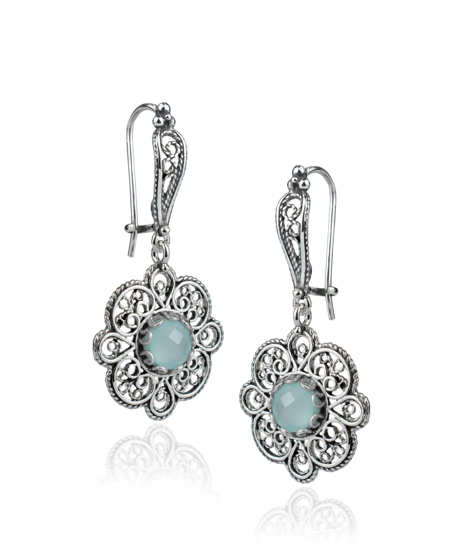 Sterling Silver Filigree Art Aqua Chalcedony Gemstone Women Dangle Drop Earrings