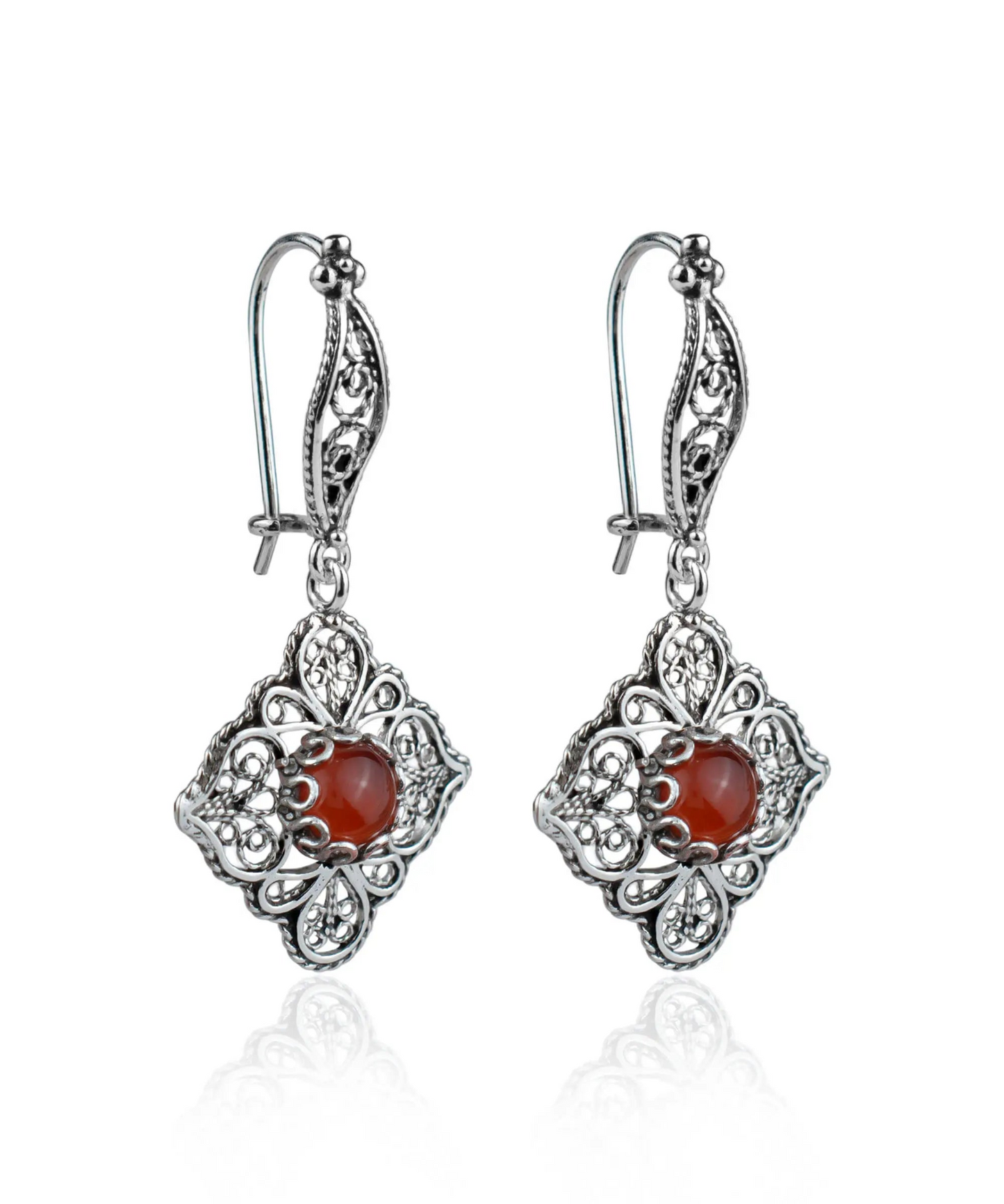 Sterling Silver Filigree Art Carnelian Gemstone Women Dangle Drop Earrings