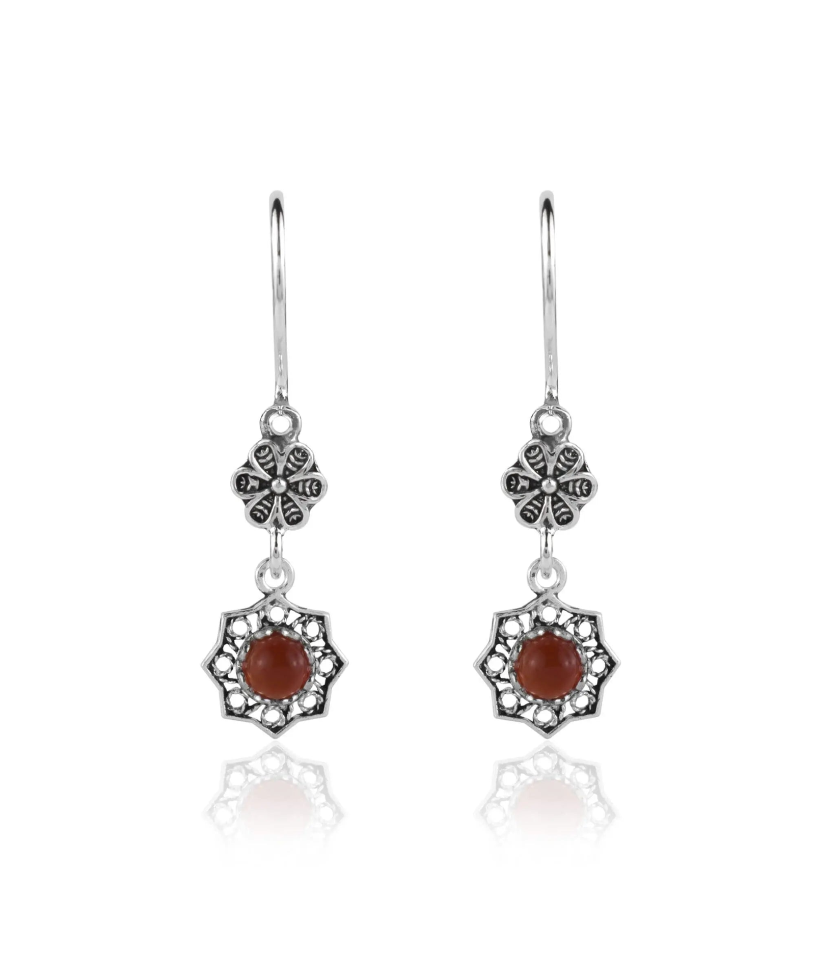 These daisy figured earrings are handmade from high-quality 925 sterling silver and feature a beautiful design with cabochon cut gemstones in your choice of Carnelian, Black Onyx, Turquoise, Green Agate, or Ruby Corundum. The earrings are both oxidized and highly polished, giving them a unique, antique-inspired look that is both elegant and timeless.