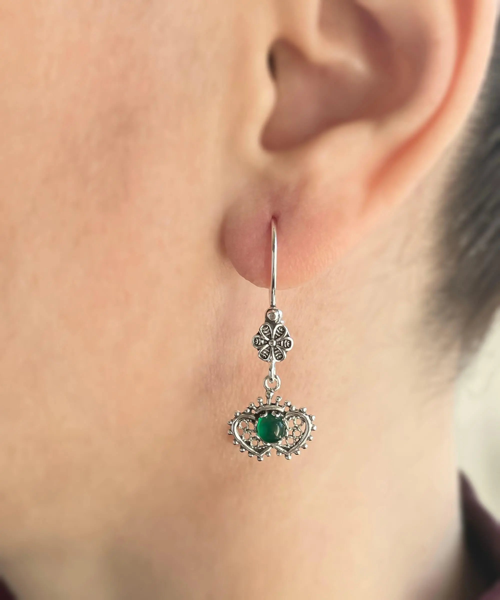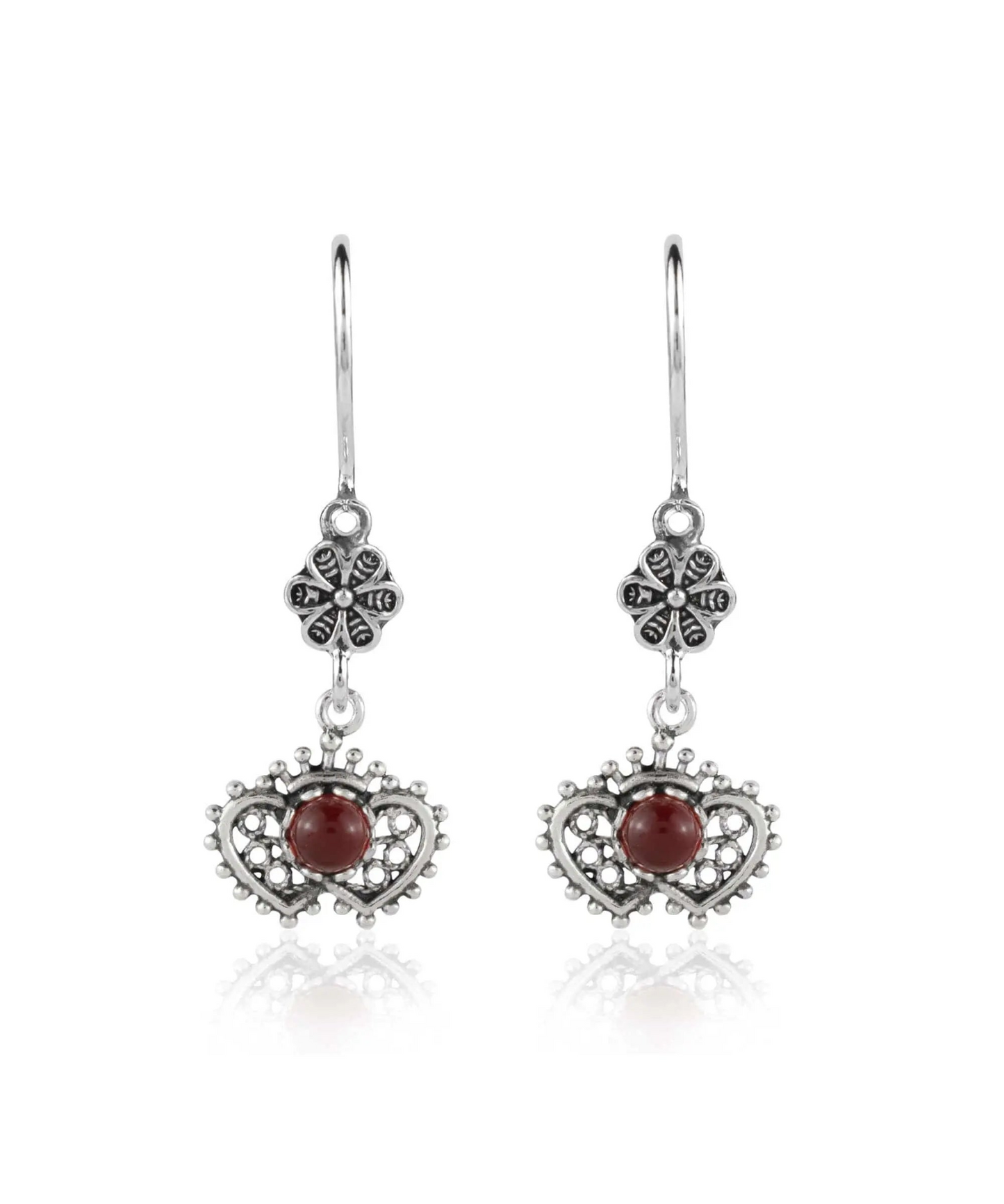 Sterling Silver Filigree Art Double Heart Gemstone Women Dangle Earrings