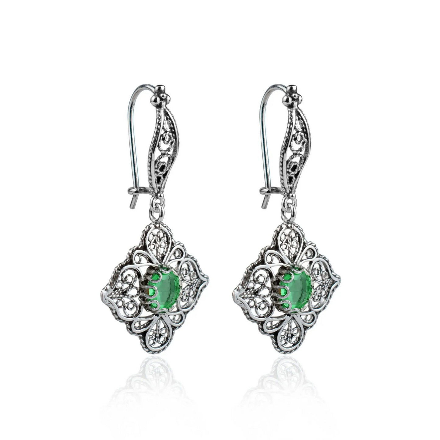 Sterling Silver Filigree Art Emerald Gemstone Woman Dangle Drop Earrings