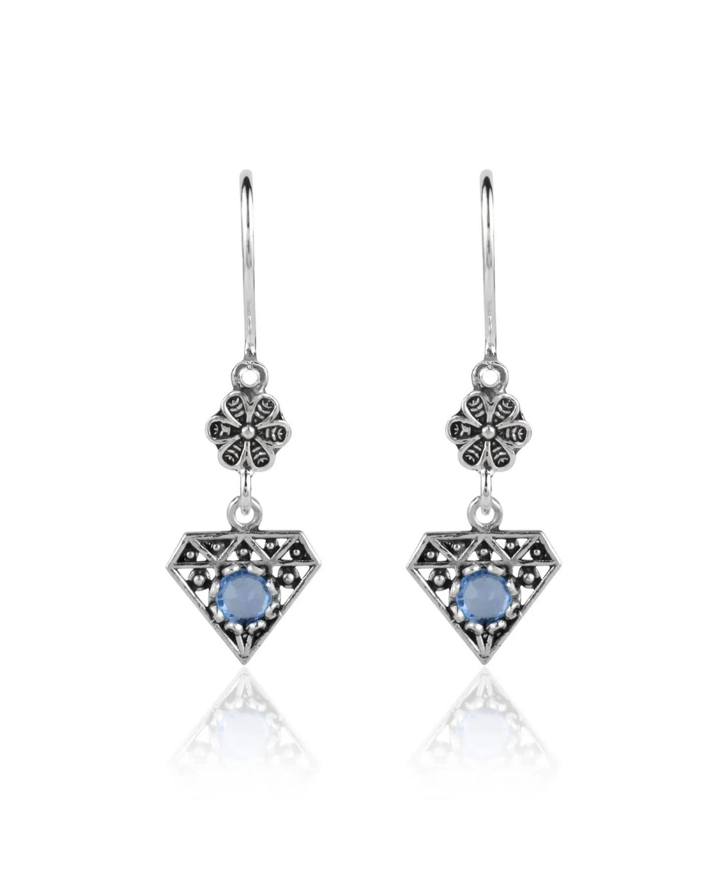 These diamond figured earrings are handmade from high-quality 925 sterling silver and feature a stunning design with double-sided faceted gemstones in your choice of Amethyst, Blue Topaz, Blue Quartz, or Citrine. The earrings are both oxidized and highly polished, giving them a unique, antique-inspired look that is both elegant and timeless.