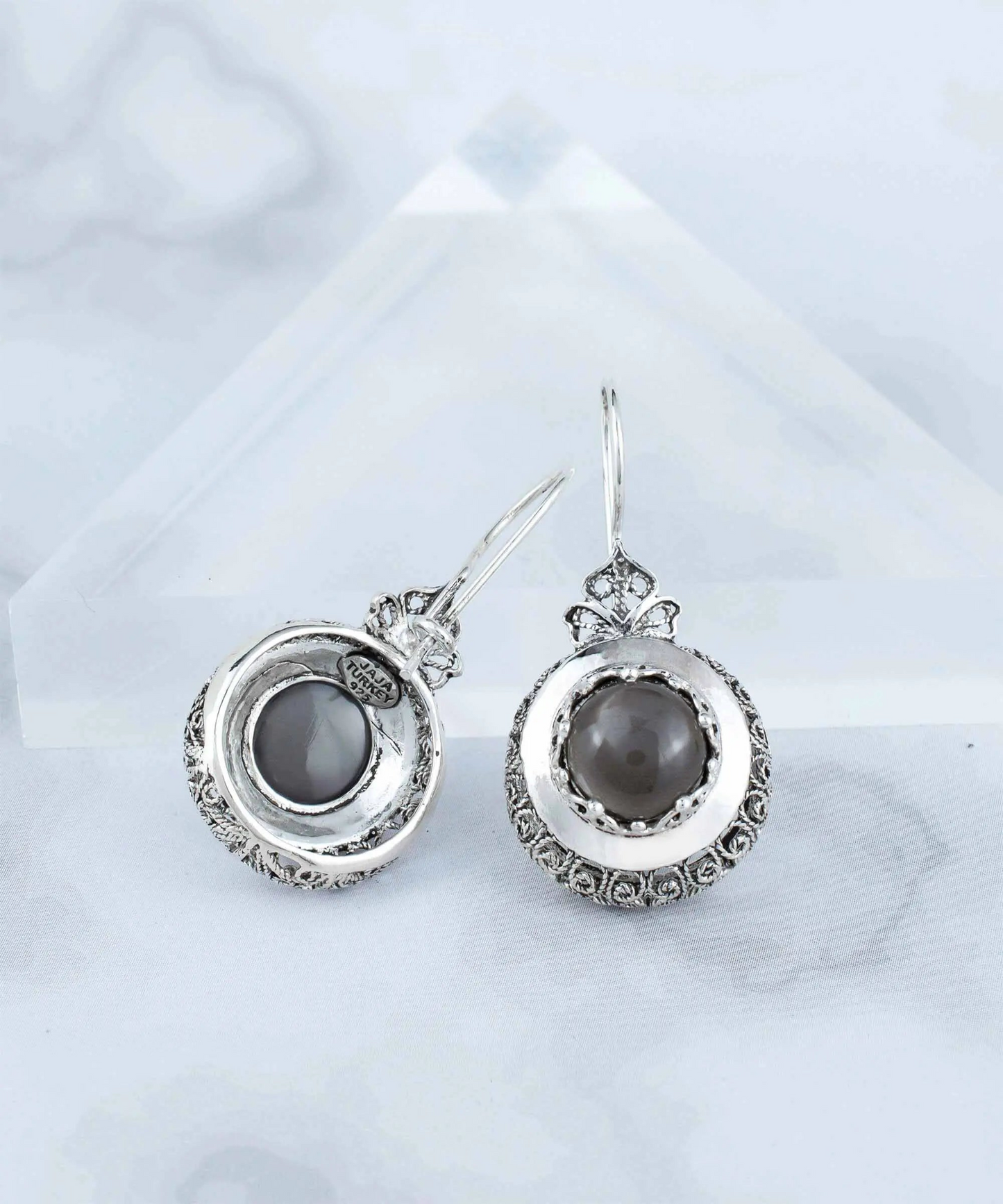 The natural iridescence of the gray moonstone gemstone creates a mesmerizing effect, adding a touch of mystical allure to these earrings. The intricate filigree art design showcases the expert craftsmanship and attention to detail that went into creating these earrings, making them a unique and elegant choice for any occasion.