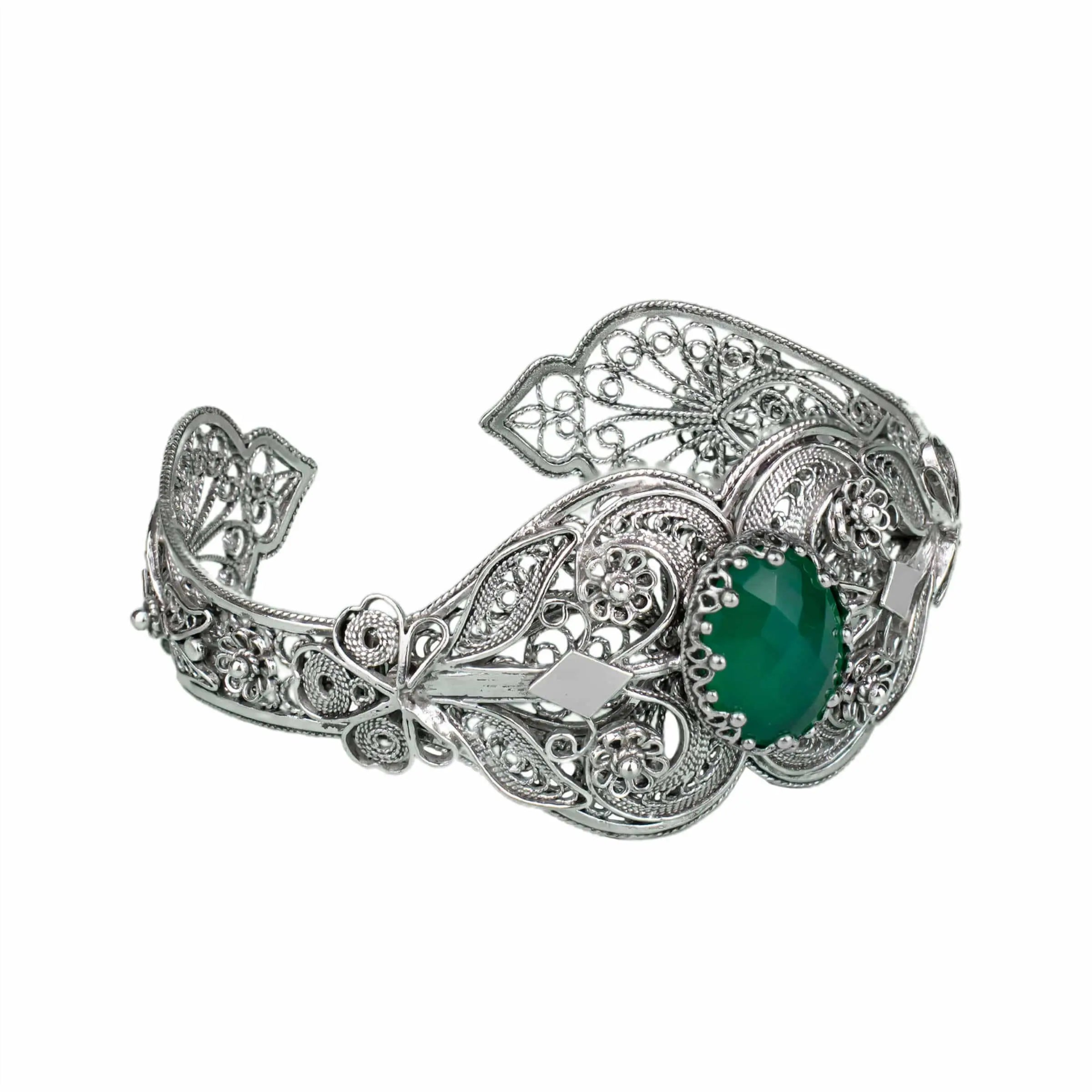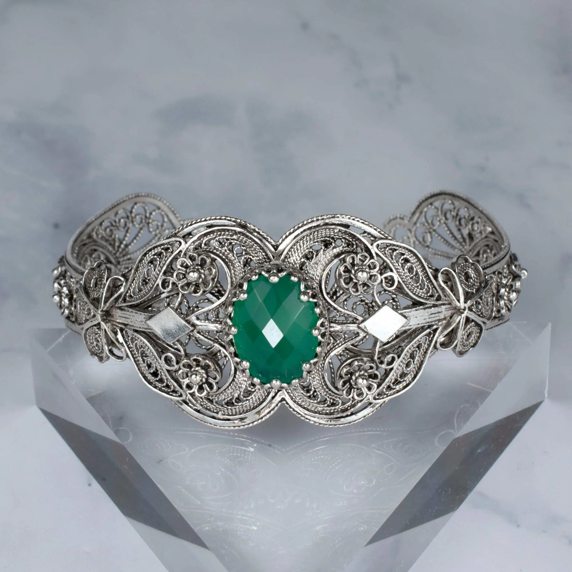 Sterling Silver Filigree Art Green Agate Gemstone Women Cuff Bracelet