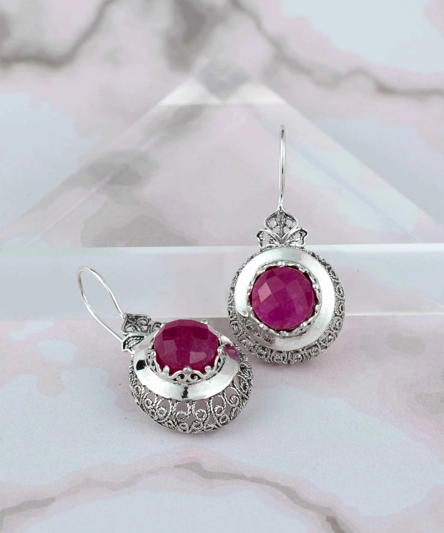 Sterling Silver Filigree Art Opaque Ruby Corundum Gemstone Women Drop Earrings