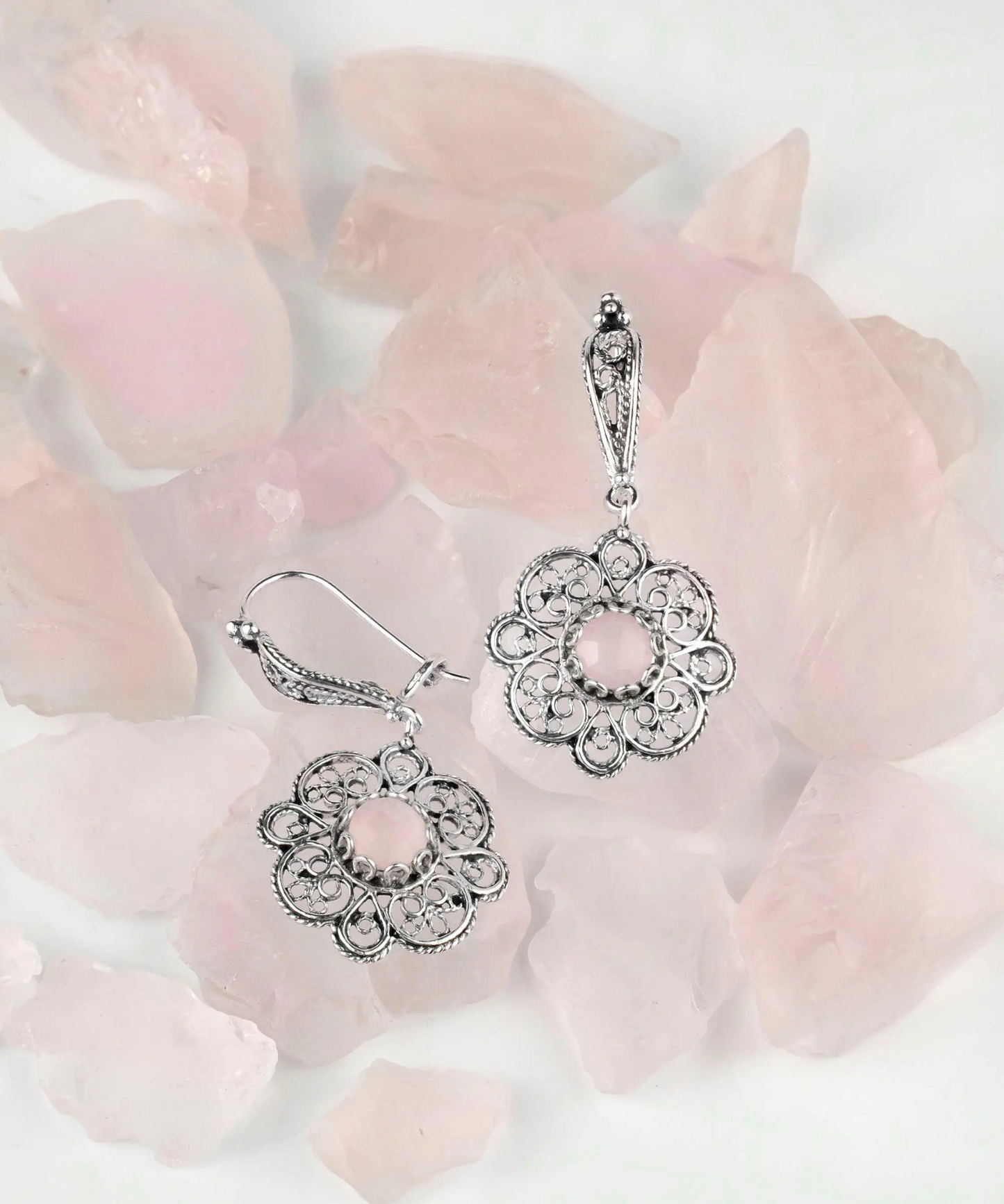 Filigree art is made of delicate metal strands that have been skillfully fashioned to create an outstanding combination of old and modern art, originating in Mesopotamia, Anatolia. Experience the beauty and sophistication of these Handmade 925 Sterling Silver Filigree Art Pink Chalcedony Gemstone Sun Figured Women Dangle Drop Earrings for yourself.