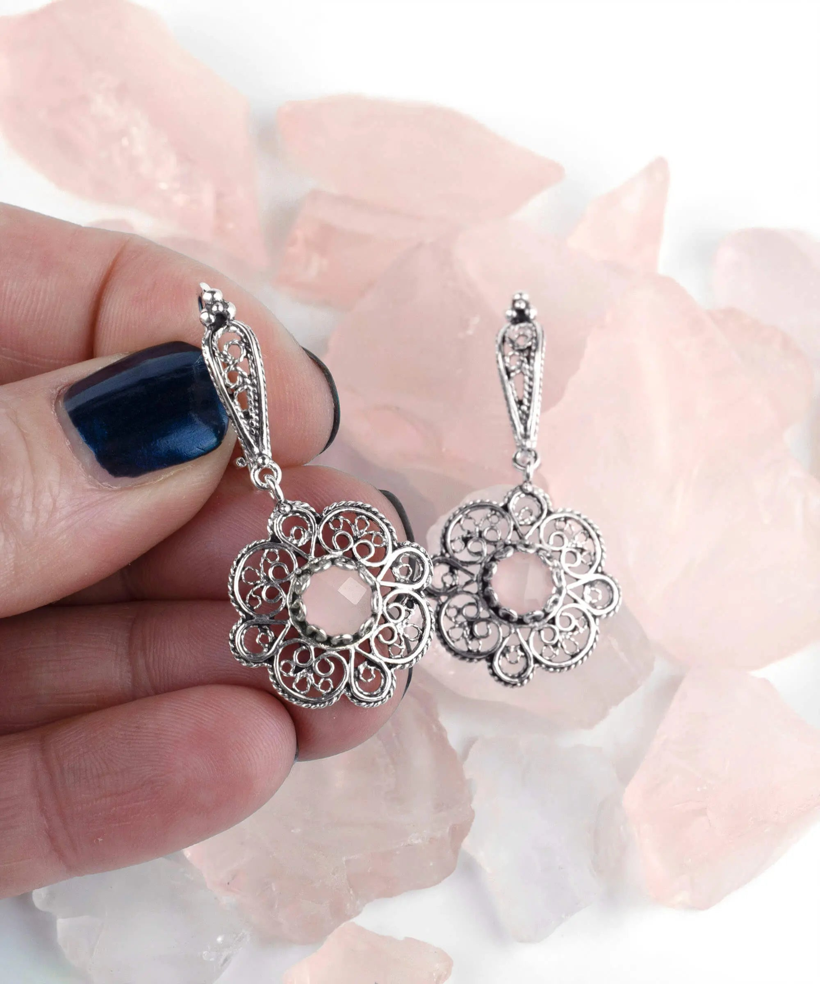 Introducing the Handmade 925 Sterling Silver Filigree Art Pink Chalcedony Gemstone Sun Figured Women Dangle Drop Earrings - a stunning piece of jewelry that is sure to make heads turn. These earrings are carefully crafted by skilled artisans using high-quality 925 sterling silver and feature intricate filigree art in a sun figure pattern.