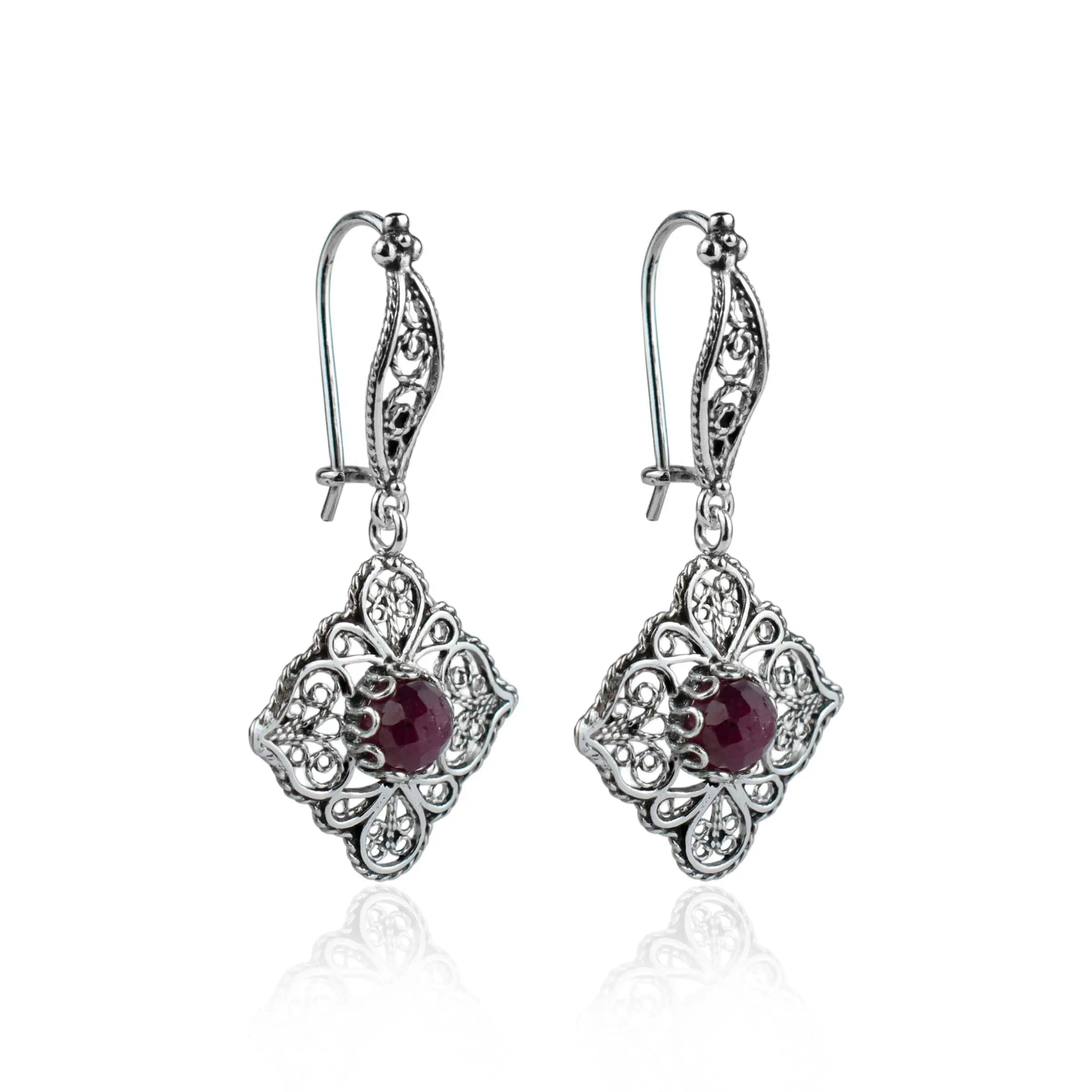 Sterling Silver Filigree Art Ruby Corundum Gemstone Women Dangle Drop Earrings