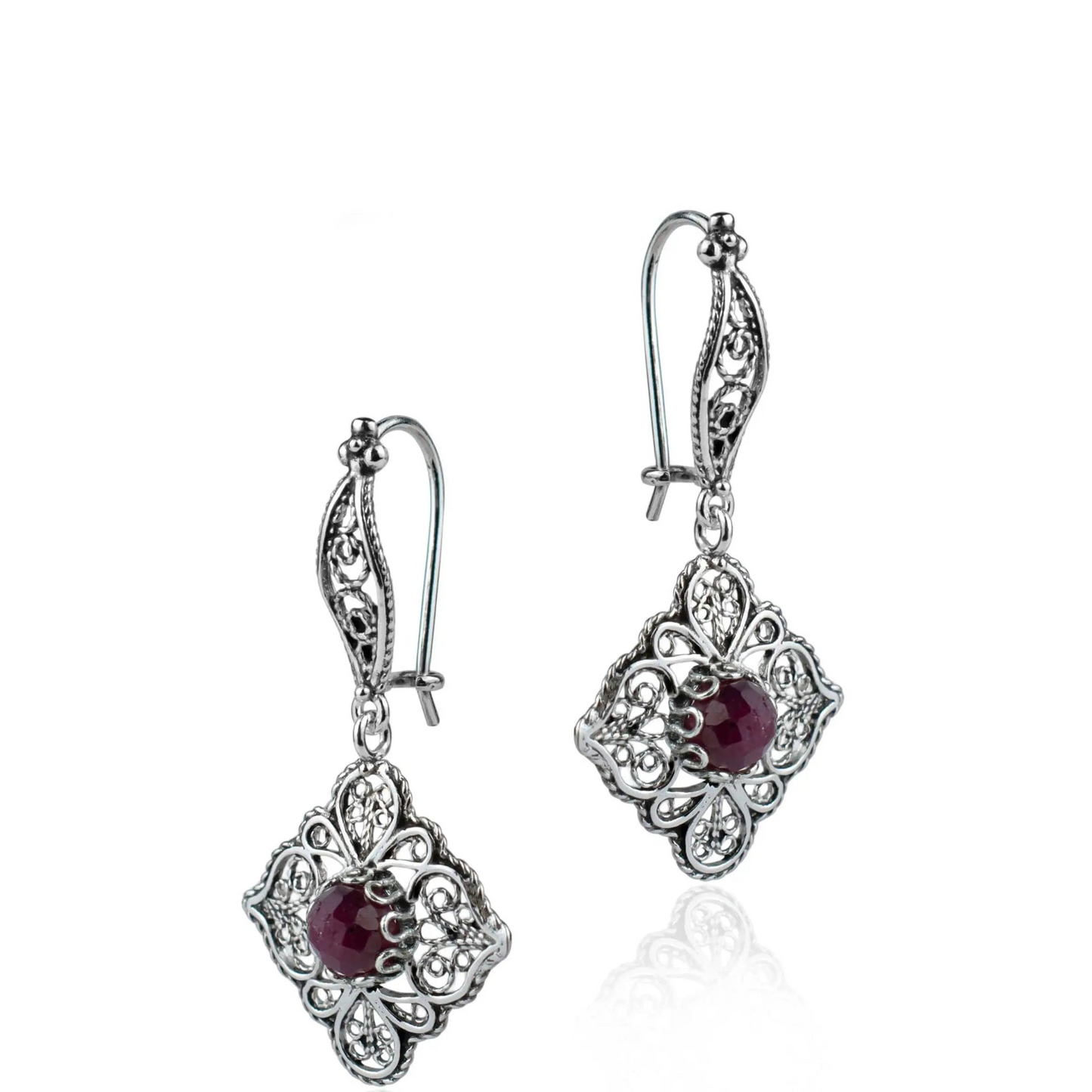 Introducing our beautiful and unique 925 sterling silver handmade filigree art flower pattern earrings with faceted round cut July birthstone Ruby Corundum gemstones. These women's dangle drop earrings are crafted from high-quality and durable 925 sterling silver, featuring intricate filigree art in a flower pattern.