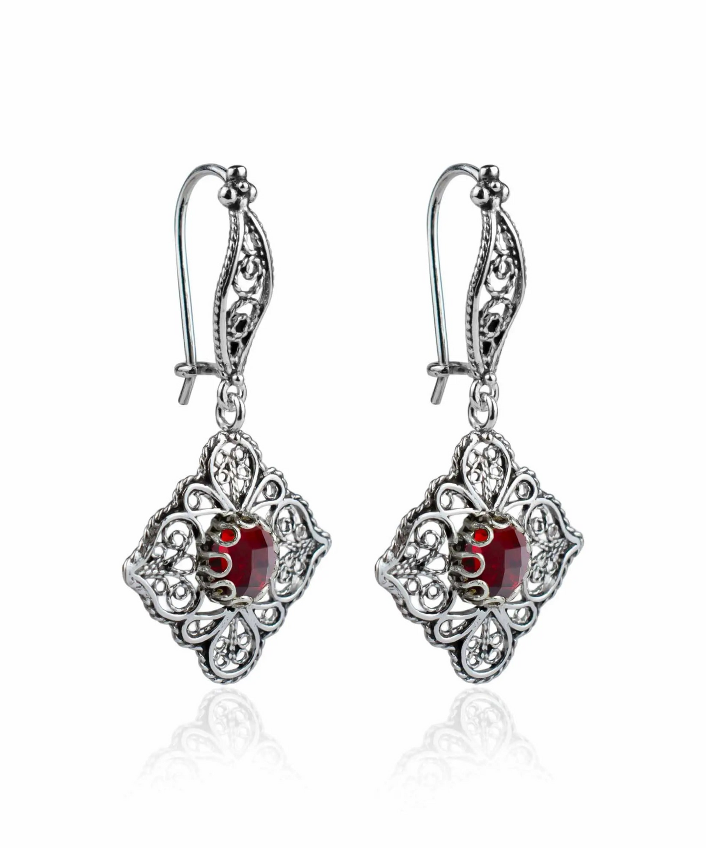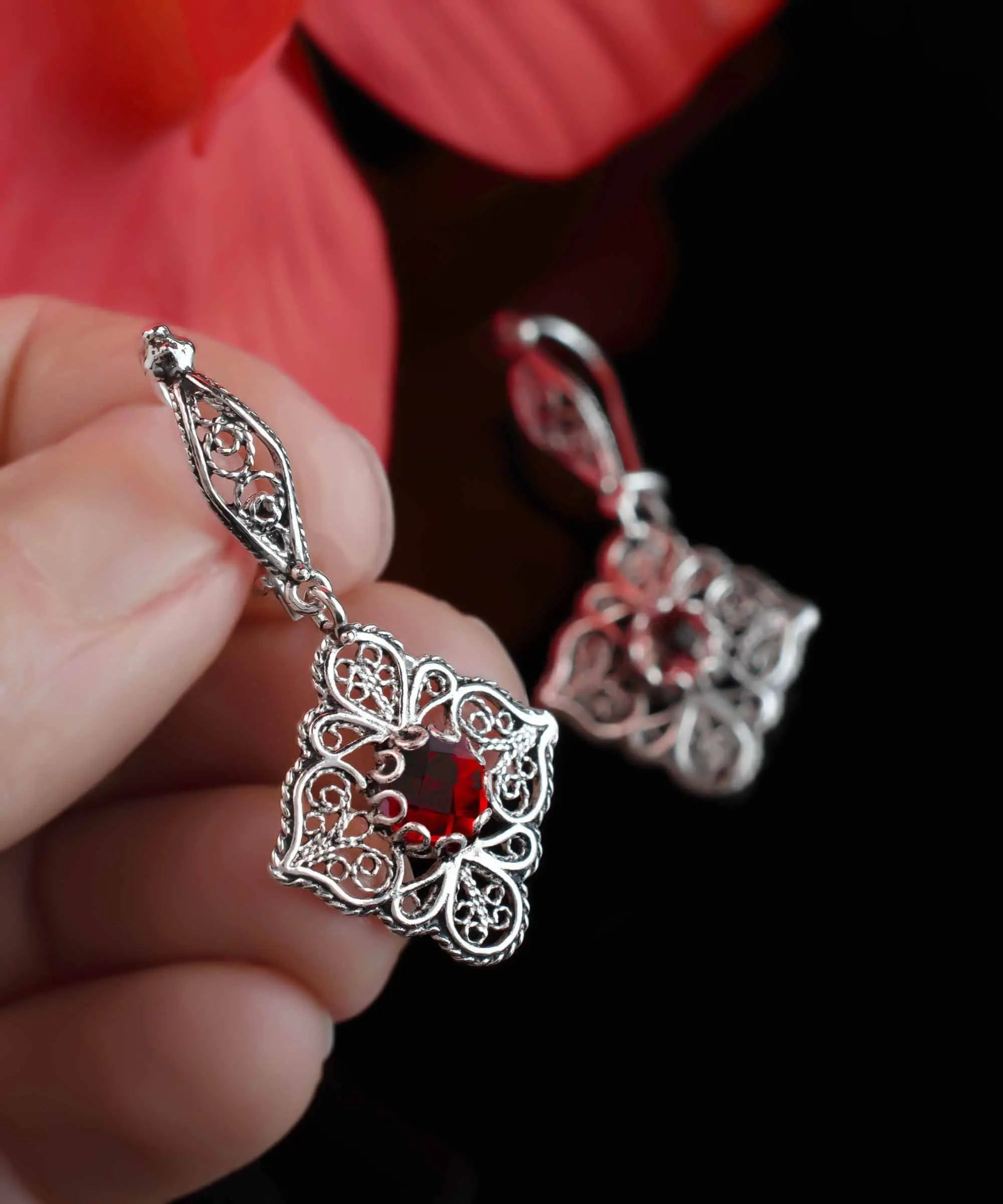 Sterling Silver Filigree Art Ruby Gemstone Women Dangle Drop Earrings