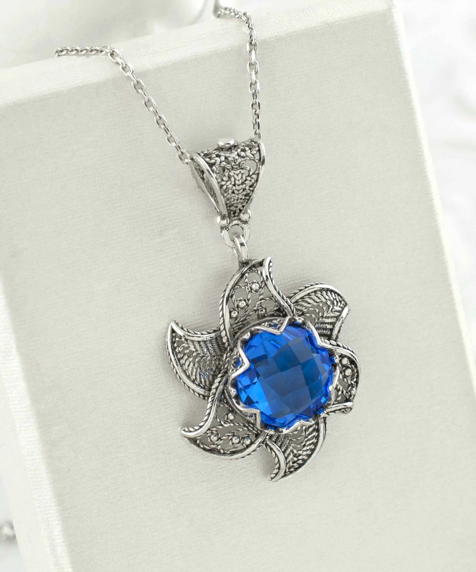 Sterling Silver Filigree Blue Quartz Gemstone Blossoming Lotus Flower Pendant Necklace