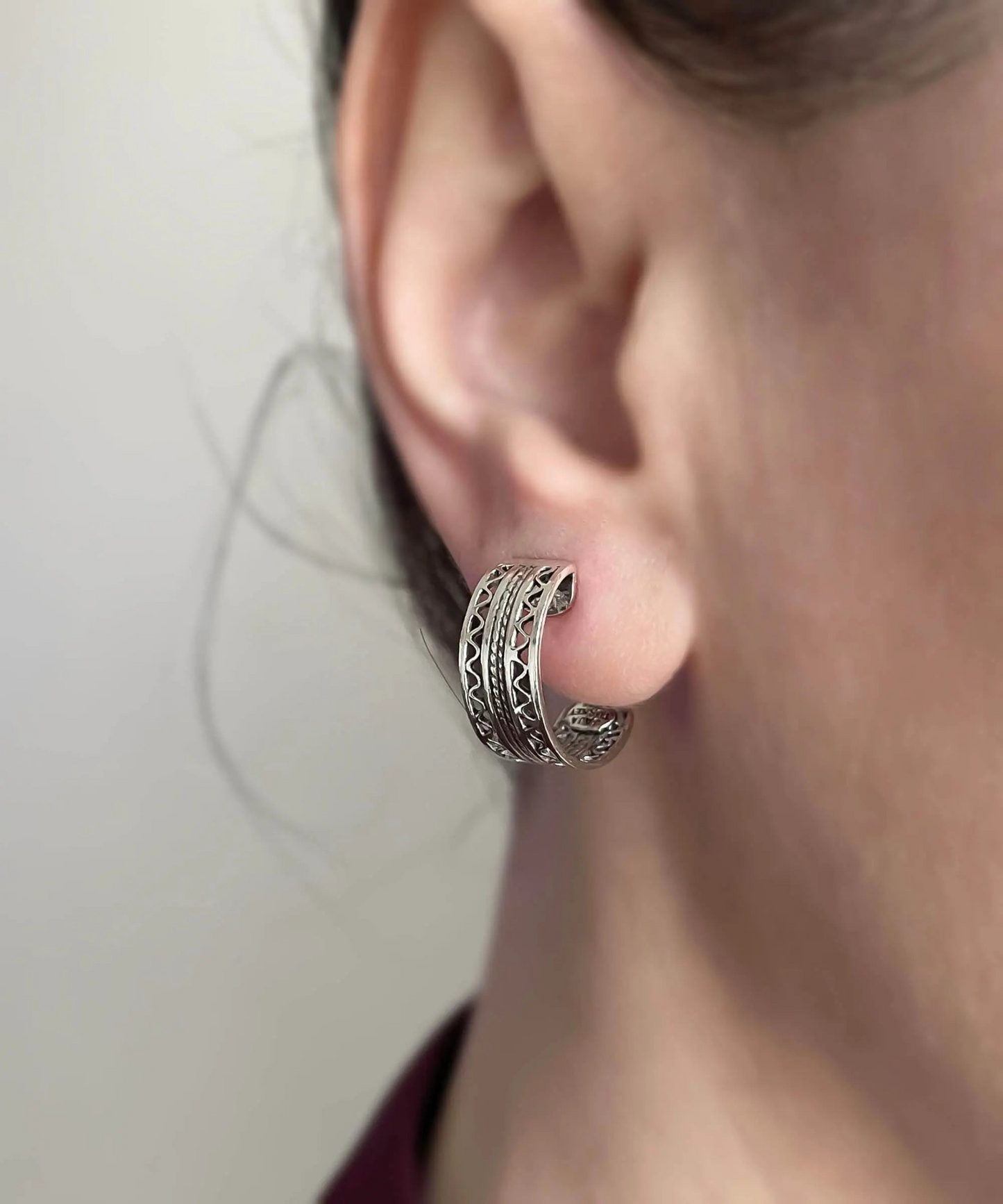 These earrings are handmade from high-quality 925 sterling silver and feature a stylish C hoop design with intricate filigree detailing. The earrings are both oxidized and highly polished, giving them a unique, antique-inspired look that is both elegant and timeless.