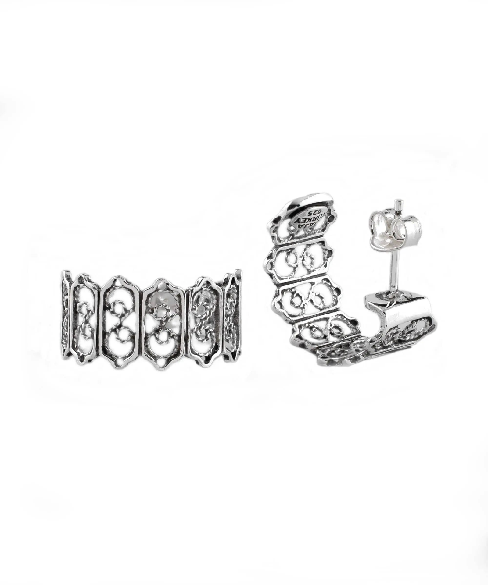 Sterling Silver Filigree Frame Design C-Hoop Stud Earrings for Women