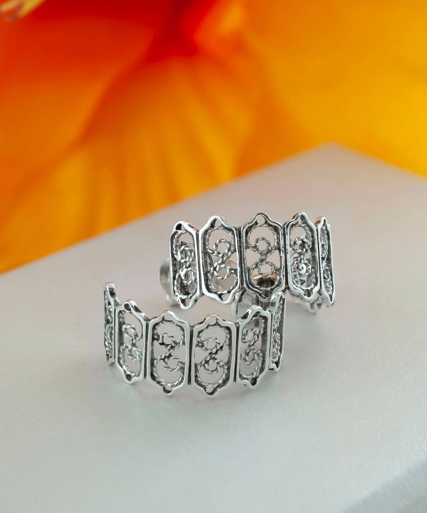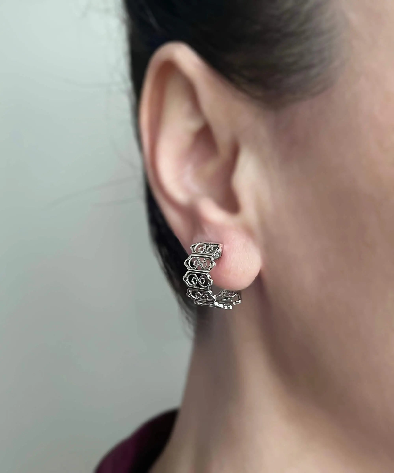 Elevate your fashion game with these stunning handmade sterling silver earrings featuring an elegant frame design with intricate filigree detailing. The C hoop design adds a trendy touch to these earrings, which are both oxidized and highly polished for a timeless and sophisticated look.