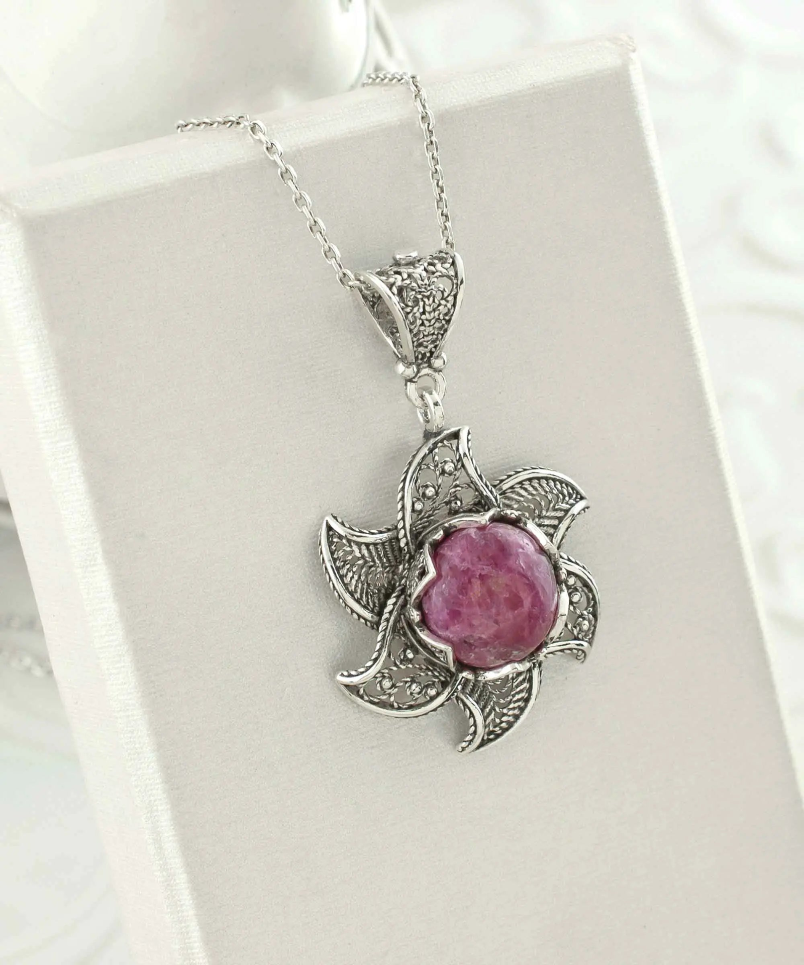 This beautiful necklace features a blossoming lotus flower pendant made of 925 sterling silver filigree art, with a stunning 12mm cabochon round cut rhodonite gemstone at the center. The pendant hangs from a delicate silver chain and would make a perfect gift for special occasions like birthdays, anniversaries, or graduations. The intricate filigree design adds a touch of elegance and sophistication, while the amethyst gemstone symbolizes peace, balance, and inner strength. This necklace is sure to make any woman feel special and cherished.