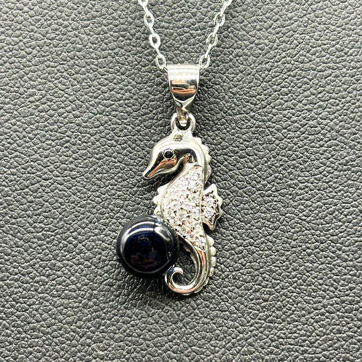 Elevate your style with our stunning new Sea Horse Aroma Necklace with black ball, a harmonious blend of exquisite design and timeless aroma. Crafted with care, the pendant and chain gleam are purely Sterling silver (925 silver) adorned with beautiful white cubic zirconia stones, while the Murano glass pieces are meticulously hand-blown.