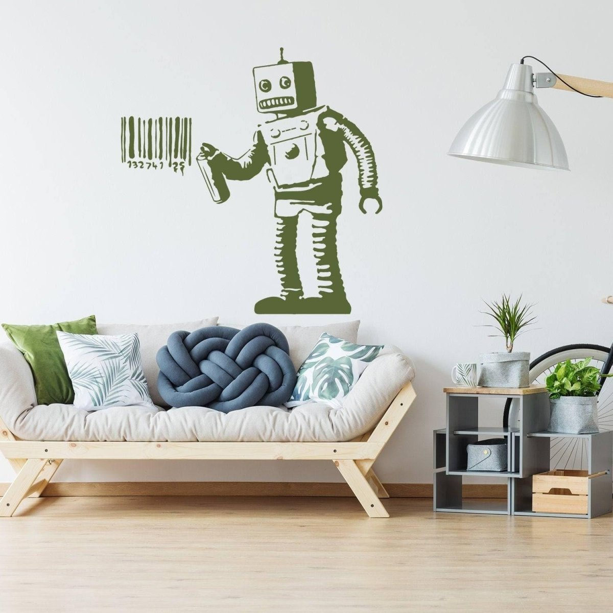 Delight yourself, your spouse, and your guests with a unique sticker design that will make everyone go 'wow!' Don't miss out on this opportunity to transform your space. Get the Banksy Barcode Robot Wall Vinyl Sticker today!