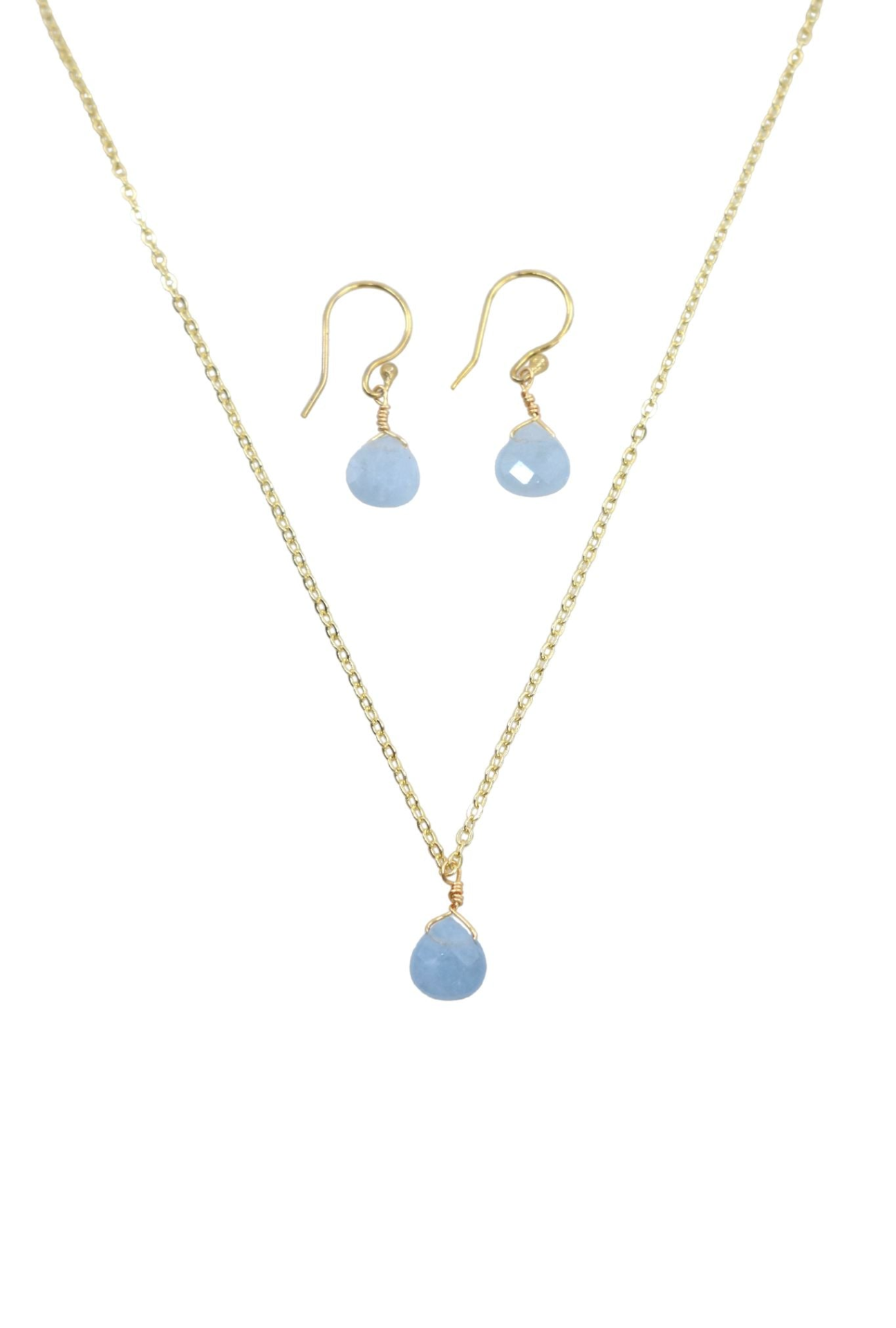 A dainty aquamarine stone hand wrapped to create a simple but sweet necklace and earring set. Stones are wrapped in 14k gold wire. The necklace is a vermeil chain with a lobster clasp.