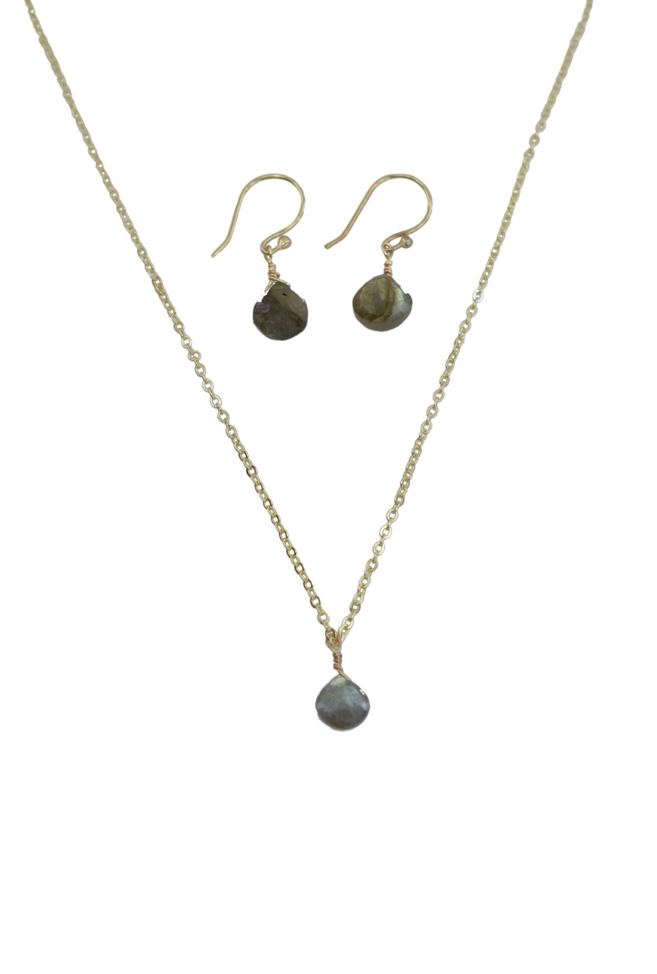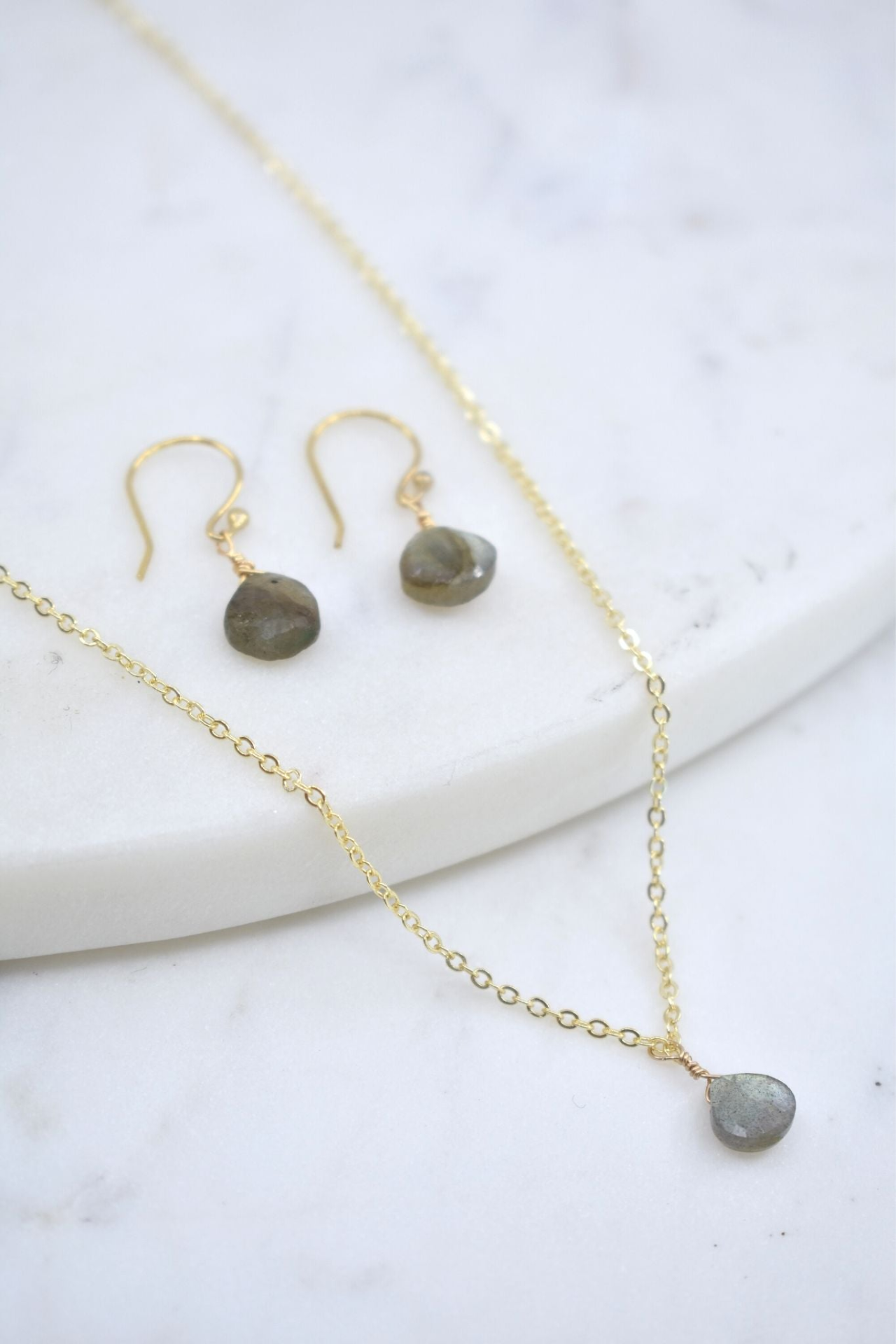 A dainty labradorite stone hand wrapped to create a simple but sweet necklace and earring set. Stones are wrapped in 14k gold wire. The necklace is a vermeil chain with a lobster clasp.