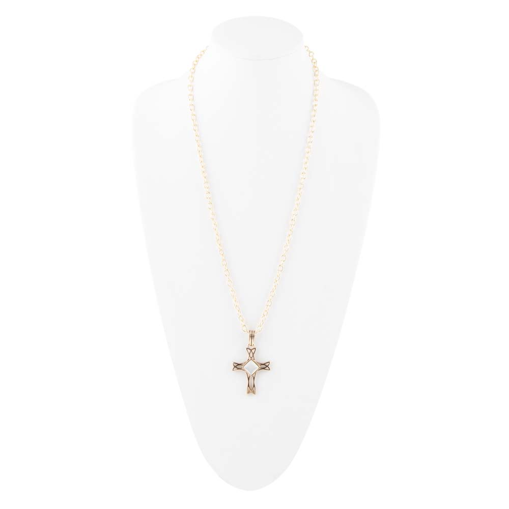 Adorned with a stunning mother of pearl stone at its center, this intricate golden cross pendant is suspended from a luxurious golden bronze chain. The necklace can be adjusted up to 30" with a convenient lobster clasp closure, while the pendant itself hangs 2.25" from the bale and measures 1.5" at its widest point. Weighing 35 grams, this necklace is crafted and finished by hand, showcasing the beautiful combination of gold and white colors. Experience the exquisite quality of mother of pearl and bronze materials in this must-have accessory.